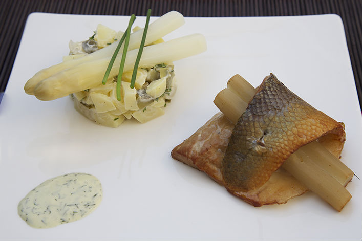 Gerookte vis met asperges en aardappelsalade