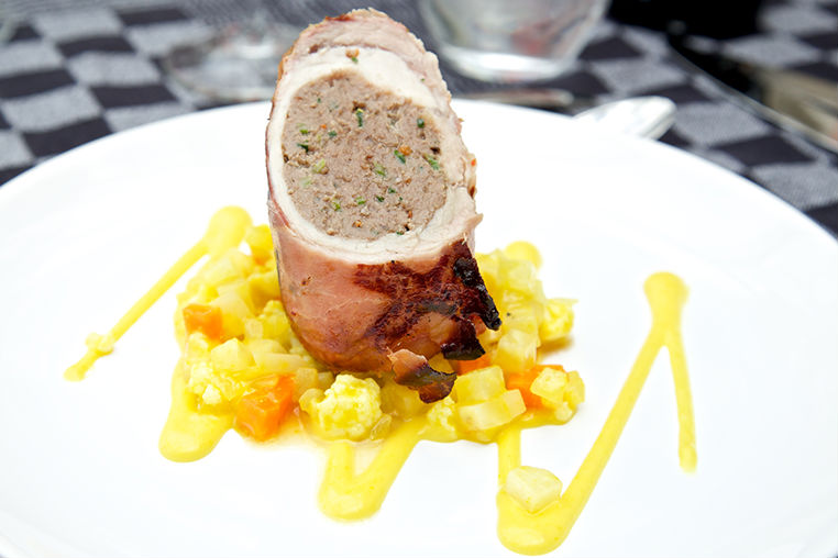 Gevulde kippenpoot met zalm in bananenblad