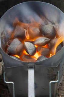 Zorg dat de ventilatieopeningen geopend zijn en leg op het rooster 2 aanmaakblokjes. Steek de aanmaakblokjes aan en plaats de starter er bovenop. Na ca. 20 min heb je mooie gloeiende kolen.